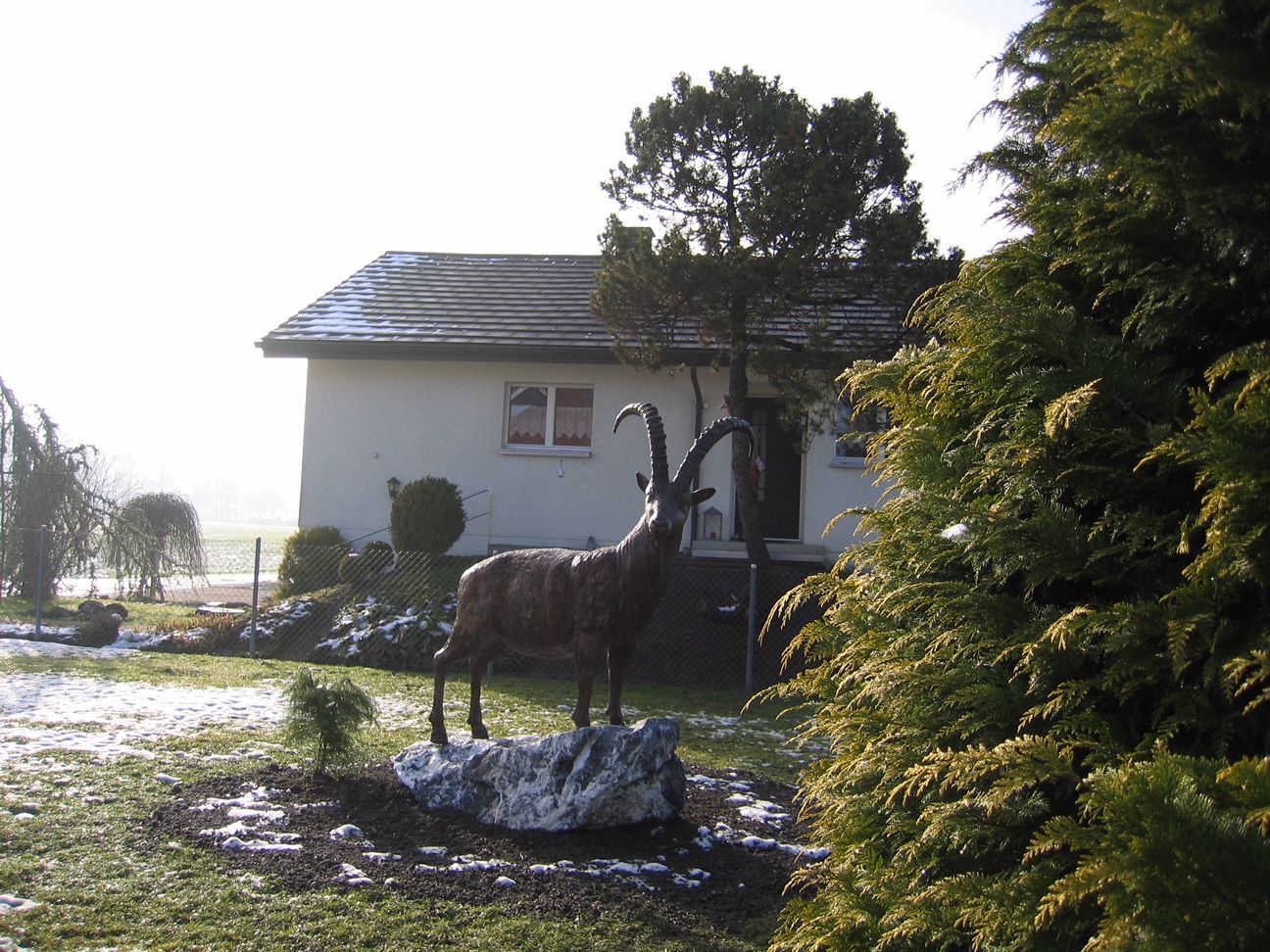 Der Steinbock ist endlich bei uns platziert worden. Er heisst Ferdinand wie der Steinmetz, der ihn montiert hat. Wir haben sehr grosse Freude an Ferdinand. Er ist wirklich wie lebendig, einfach ein Prachtskerl.